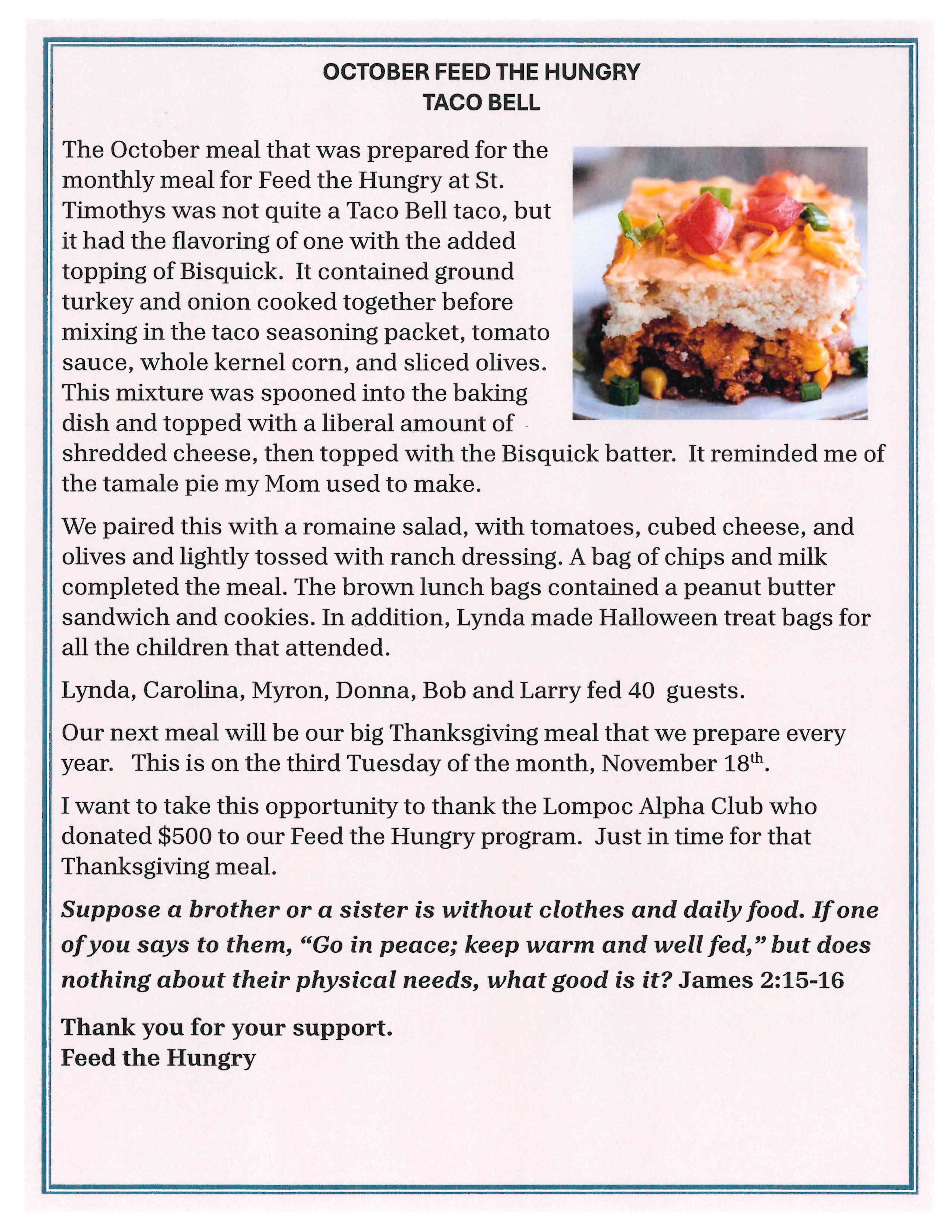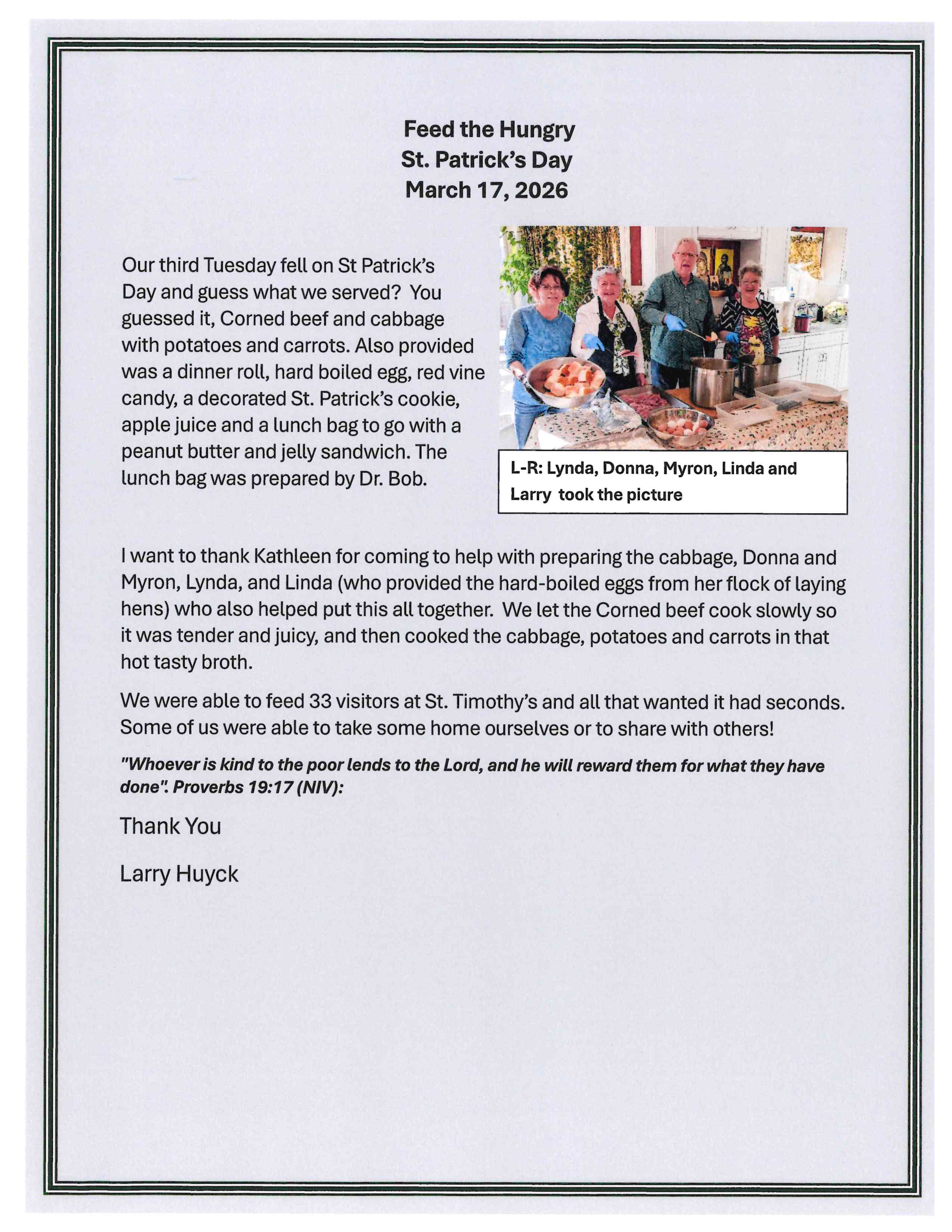 Do you like to prepare food? Would you like to help others in our community? We prepare hot meals in our kitchen on the third Tuesday of each month at 3:00 pm and deliver to St. Timothy's Orthodox Church (403 No. J Street) at 5:30pm. We have a great time too! If you would like to help out, just let us know.