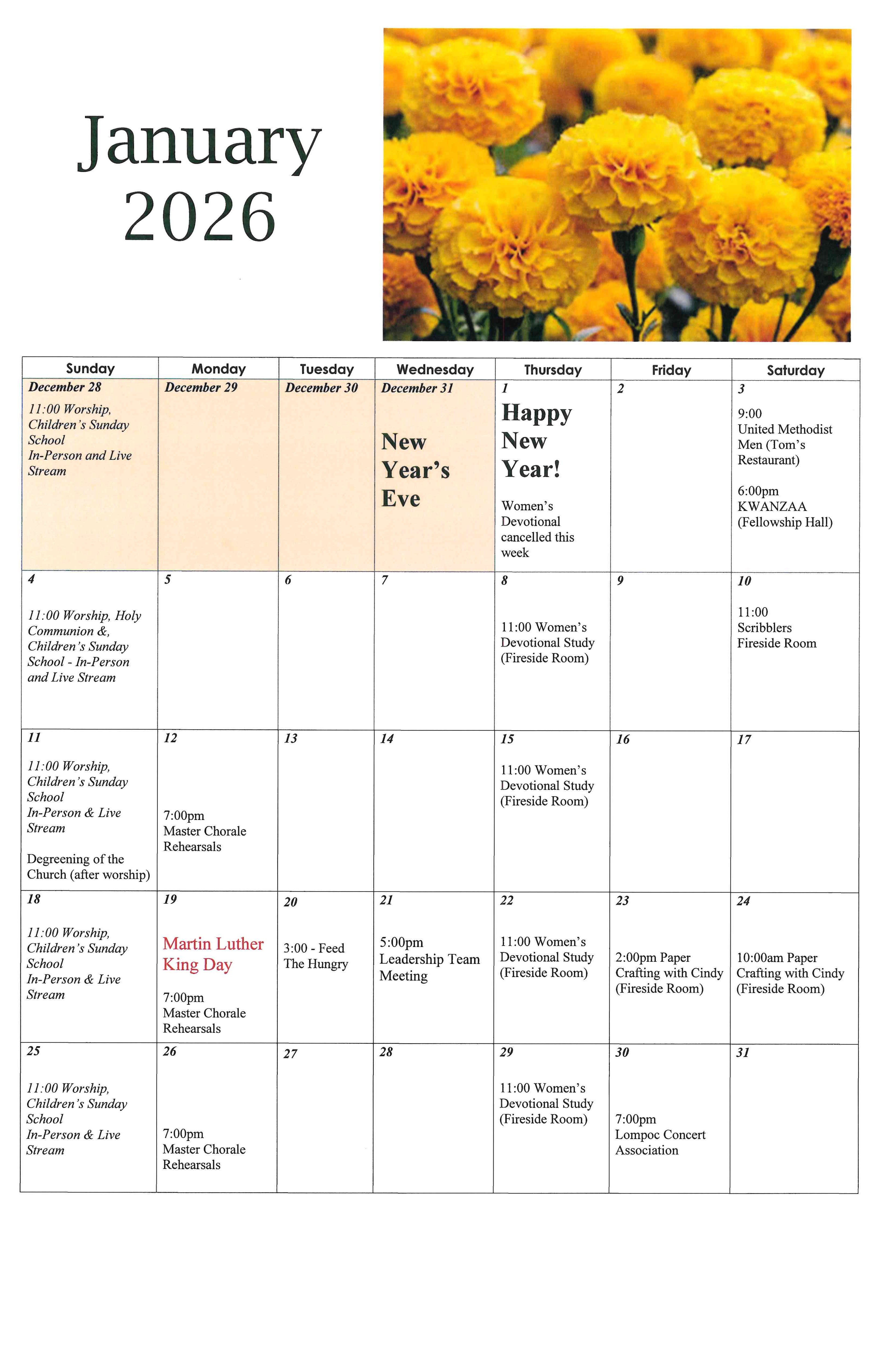 The discussion group meets Thursday mornings at 11:00 in the Fireside Room. We are studying the January - February 2026 Upper Room Daily Devotional Guide. You can stop by the Church office to pick up your free copy of Upper Room if you don't have one already. Hope to see you soon.